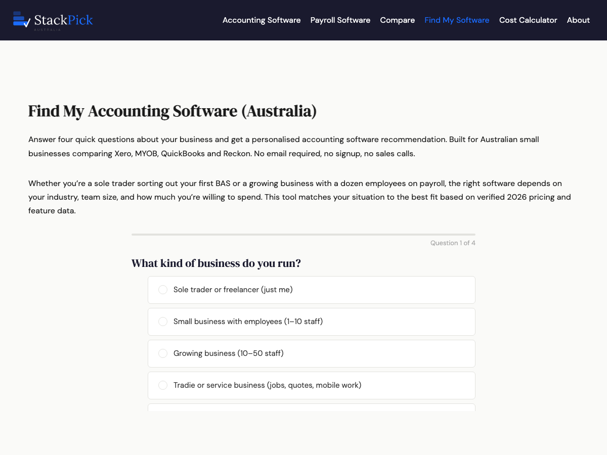 Find My Accounting Software by StackPick is a niche utility designed to help businesses navigate software procurement. While the core content structure—including H1 hierarchy and JSON-LD implementation—is technically sound, the platform suffers from significant gaps in modern discoverability and security infrastructure.