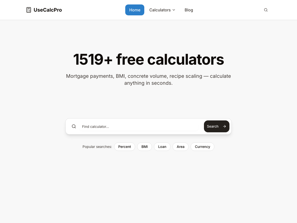 UseCalcPro is a functional web-based calculation tool that demonstrates strong foundational web practices, including proper SEO structure, security headers, and structured data implementation.